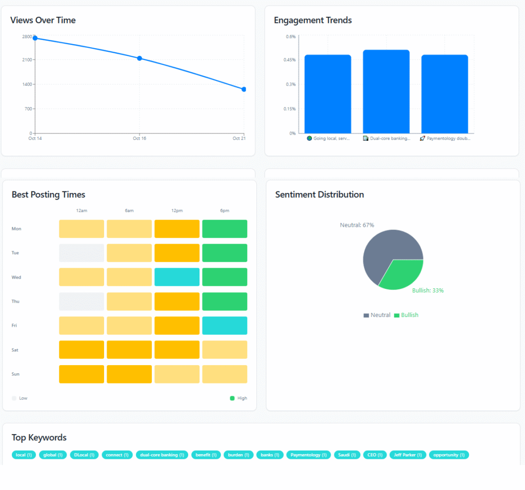 • Tracks channel performance, audience mood, content effectiveness, competitive rank